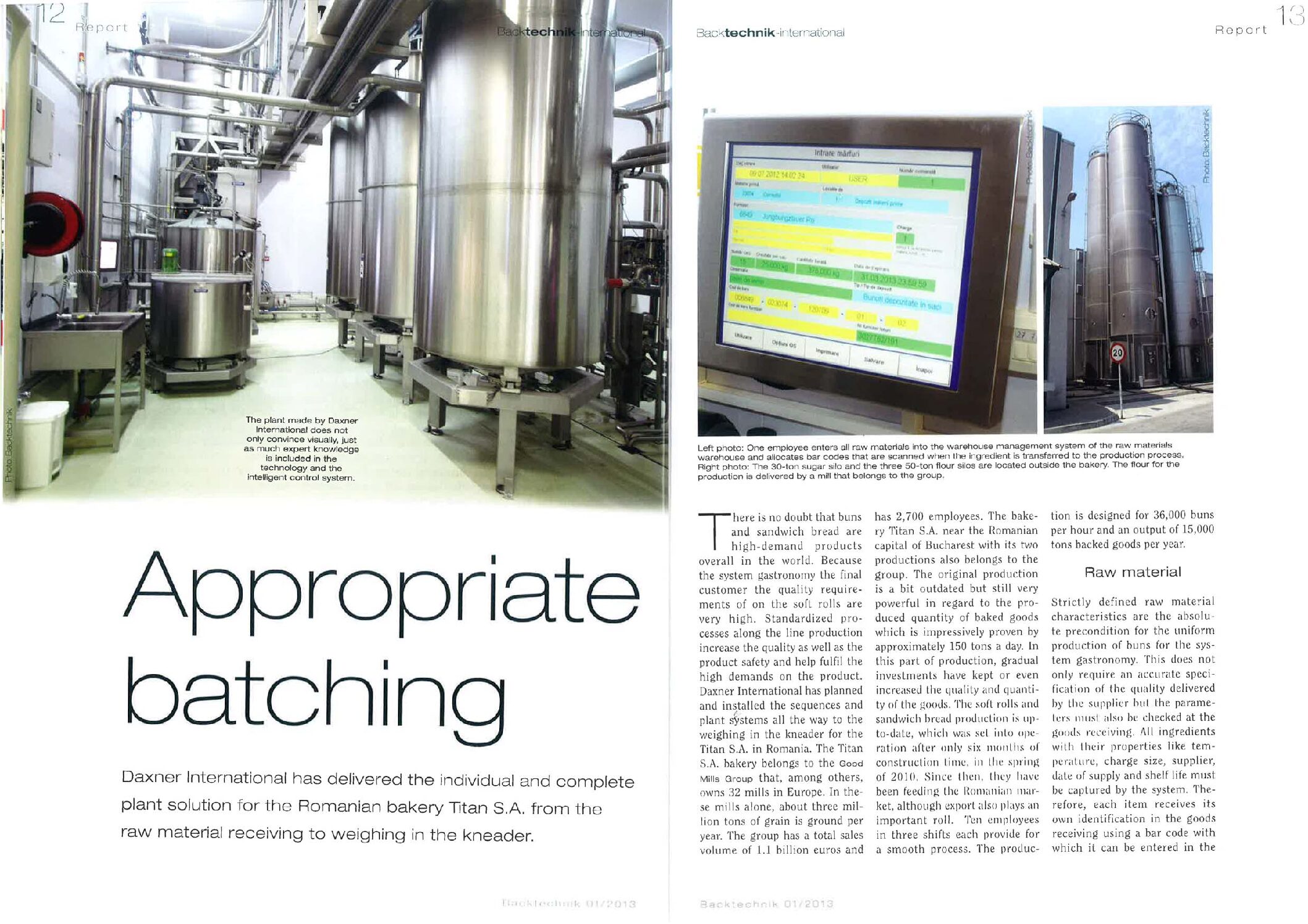 Strictly defined raw material characteristics are the absolute precondition for the uniform production of buns for the system gastronomy. All ingredients with their properties like temperature, charge size, supplier, date of supply and shelf life must be captured by the system. Therefore, each item receives its own identification in the goods receiving using a bar code with which it can be entered in the warehouse. lf the raw material is requested from the production area, an employee reads the raw material out again and transfers it into the production system. The system automatically performs usual queries, e.g. “first in first out” or minimum order quantities, and with this, it ensures a smooth process. Large quantity ingredients like flour and sugar are stored in outdoor silos of the bakery.
